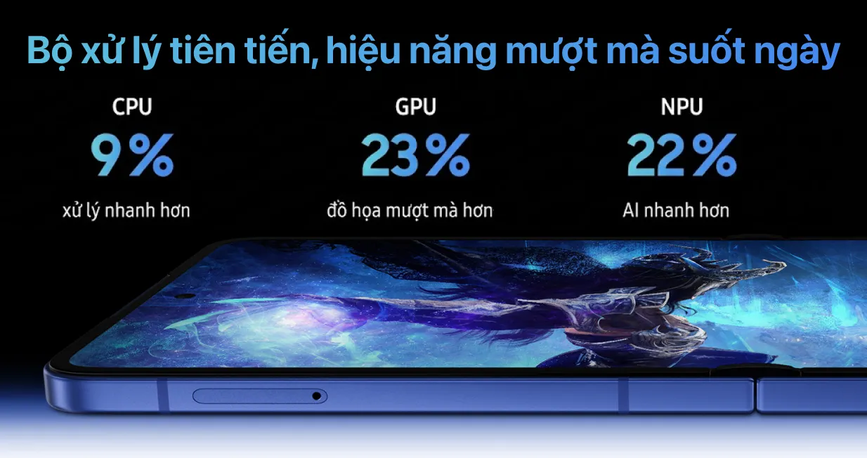 Điện thoại Samsung Galaxy Z Flip 7 12GB 512GB sở hữu bộ xử lý Samsung Exynos 2500 được tối ưu riêng cho dòng Galaxy. Con chip cao cấp, mạnh mẽ này giúp điện thoại Z Flip 7 thực hiện các tác vụ AI mượt mà, xử lý đồ hoạ ổn định. Dung lượng RAM 12GB mang đến khả năng đa nhiệm vượt trội, xử lý tác vụ nhanh chóng.