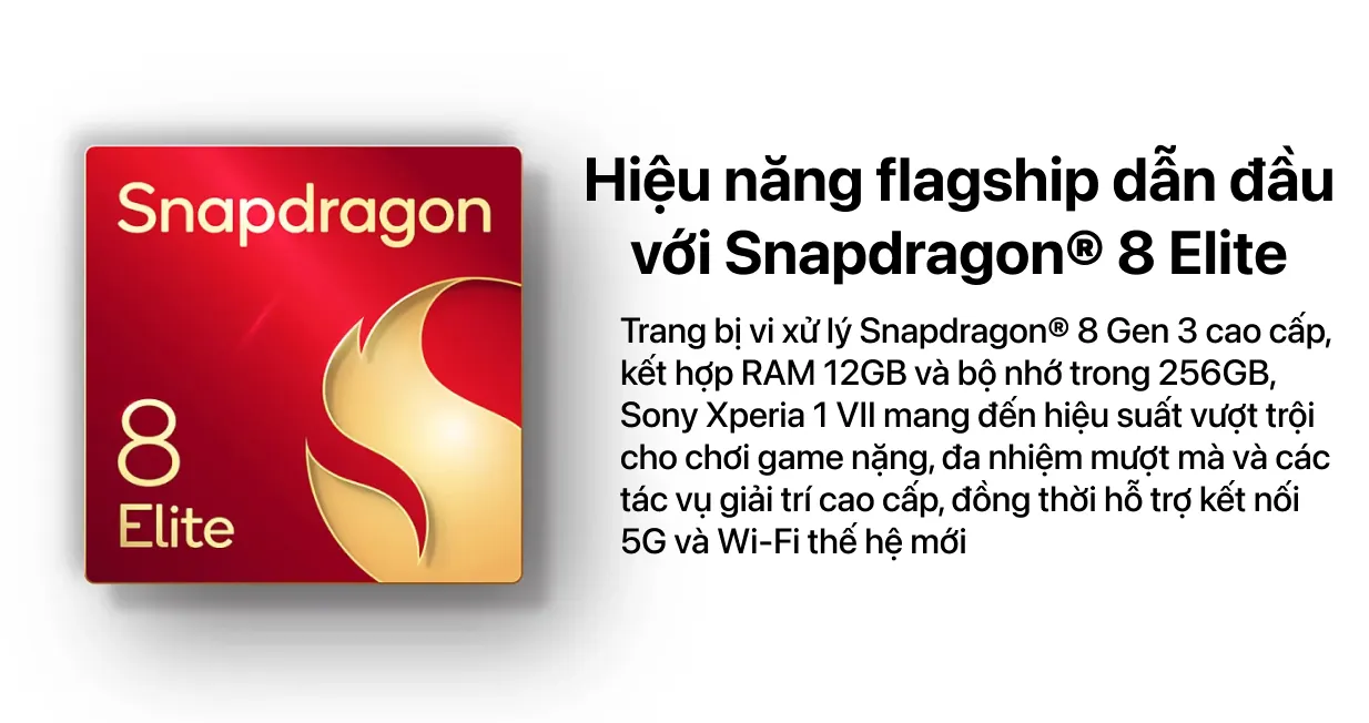 Sony Xperia 1 VII sử dụng chip Snapdragon 8 Elite mới nhất, sử dụng CPU Qualcomm Oryon với tốc độ đến 4.32GHz. Máy còn có 12GB RAM và bộ nhớ trong là 256GB, chạy Android 15 có thể xử lý đa nhiệm.
