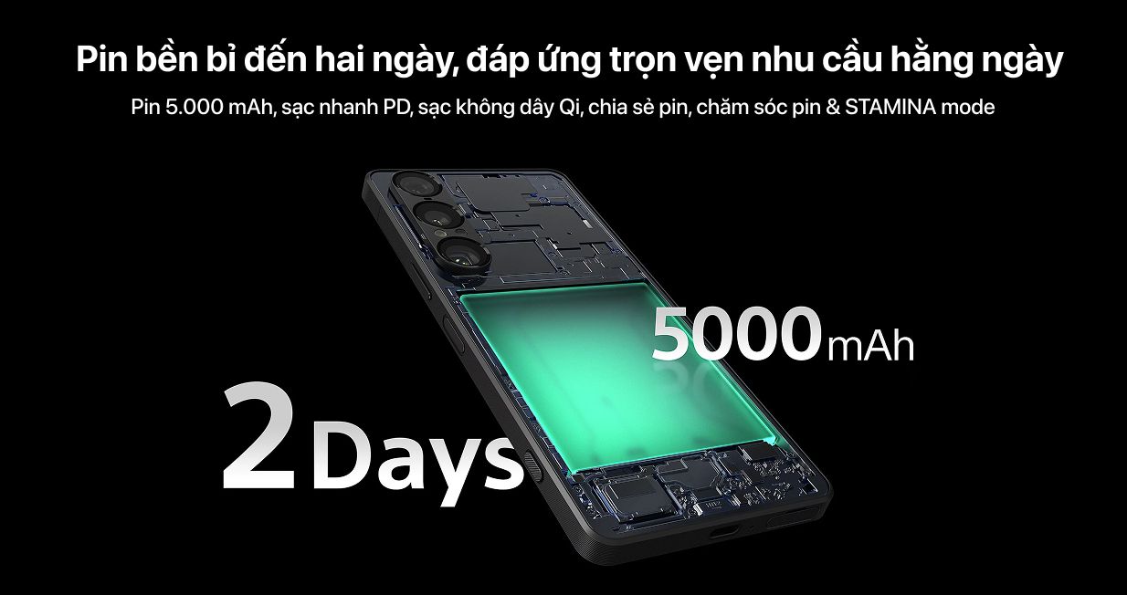 Điện thoại Sony Xperia 1 VII có viên pin dung lượng đến 5000mAh cho thời gian sử dụng lên đến 2 ngày với các tác vụ thông thường. Máy cho phép xem video liên tục hơn 36 giờ, lý tưởng cho người dùng yêu thích xem phim.