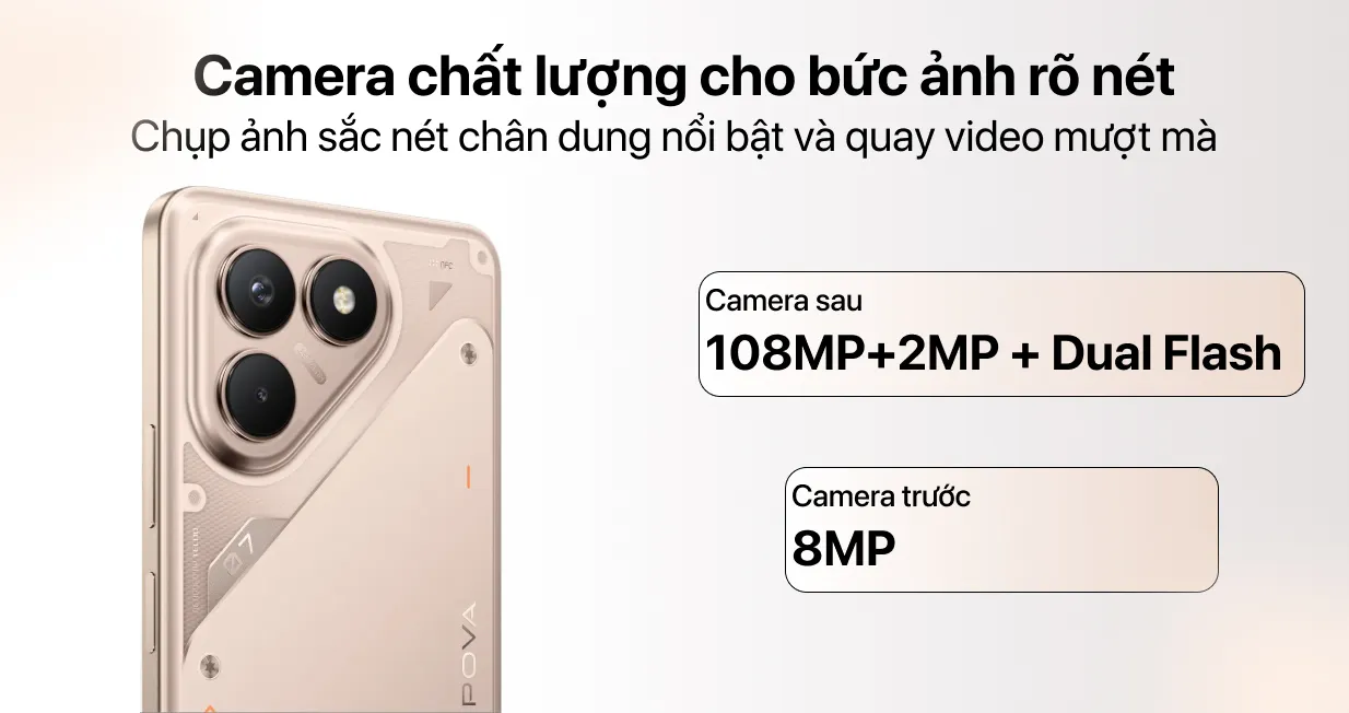 Với camera chính độ phân giải 108 MP, Pova 7 mang lại khả năng chụp ảnh chi tiết, sắc nét ngay cả trong điều kiện ánh sáng yếu. Ngoài ra, công nghệ chống rung quang học (OIS) của máy cũng được đánh giá cao khi giúp ổn định hình ảnh khi quay video hoặc chụp chuyển động nhanh.