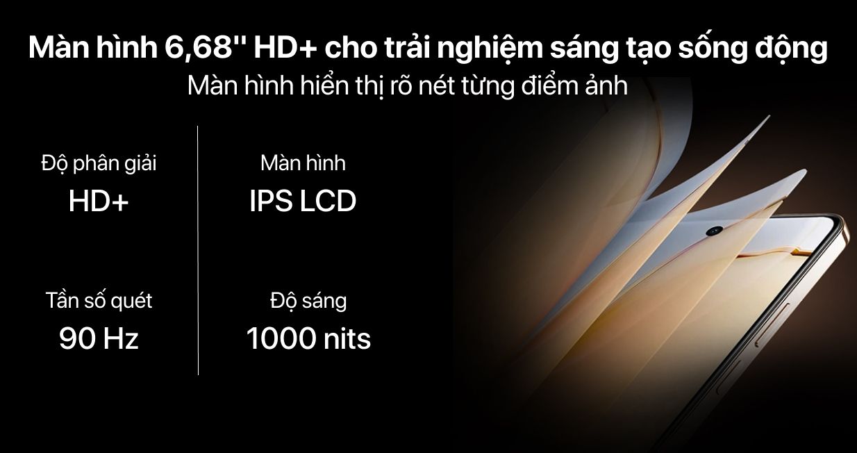 Với kích thước 6.68 inch, màn hình của điện thoại vivo Y28 sẽ cung cấp cho người dùng một không gian hiển thị rộng lớn, đáp ứng tốt các nhu cầu giải trí. Độ phân giải màn hình 1608 x 720 pixels mang tới khả năng hiển thị sắc nét để không gây mỏi mắt, nhoè mắt khi sử dụng trong thời gian dài. Màn hình của vivo Y28 còn có độ sáng đạt mức 1000 nits để thoải mái sử dụng dưới trời nắng mà không làm giảm sút chất lượng hiển thị. Đặc biệt, máy còn có công nghệ bảo vệ mắt