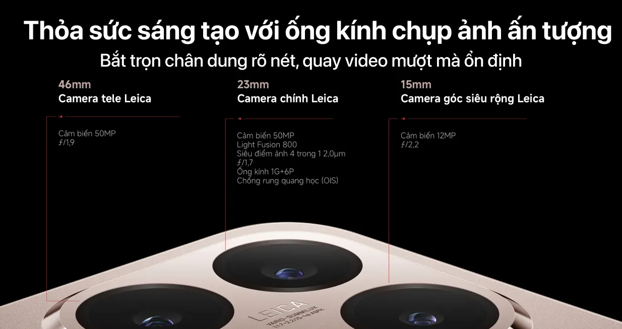 • Camera chính 50MP Leica: khẩu độ lớn f/1.7, sử dụng cảm biến Light Fusion 800 (Dải tần nhạy sáng cao tương đương máy ảnh chuyên nghiệp. Giúp ghi lại chính xác màu sắc, những chi tiết chuyển động ngoài sáng, trong tối tốt hơn