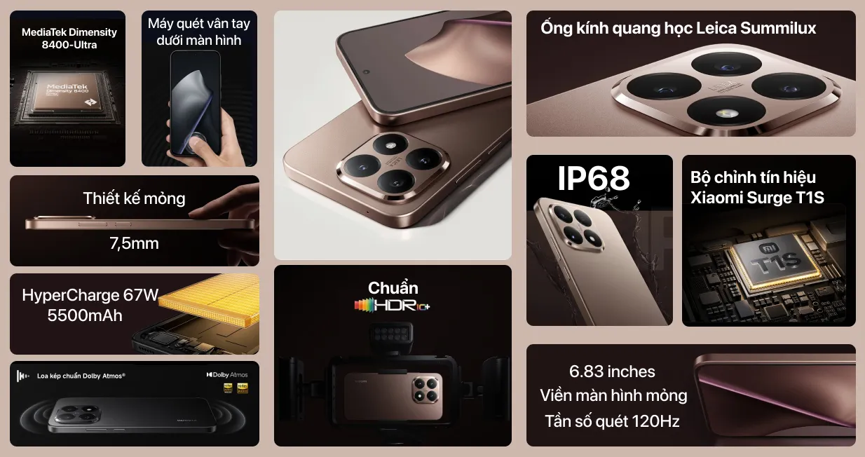 Cấu hình và khả năng nhiếp ảnh Về vận hành, máy trang bị vi xử lý Dimensity 8400-Ultra cùng chuẩn RAM LPDDR5X, đảm bảo tốc độ phản hồi nhanh khi xử lý đa nhiệm và tác vụ nặng. Hệ thống quang học được tinh chỉnh bởi Leica với cảm biến chính 50MP, kết hợp ống kính tele và góc rộng, hỗ trợ tái tạo màu sắc tự nhiên và đáp ứng đa dạng nhu cầu chụp ảnh chuyên nghiệp.