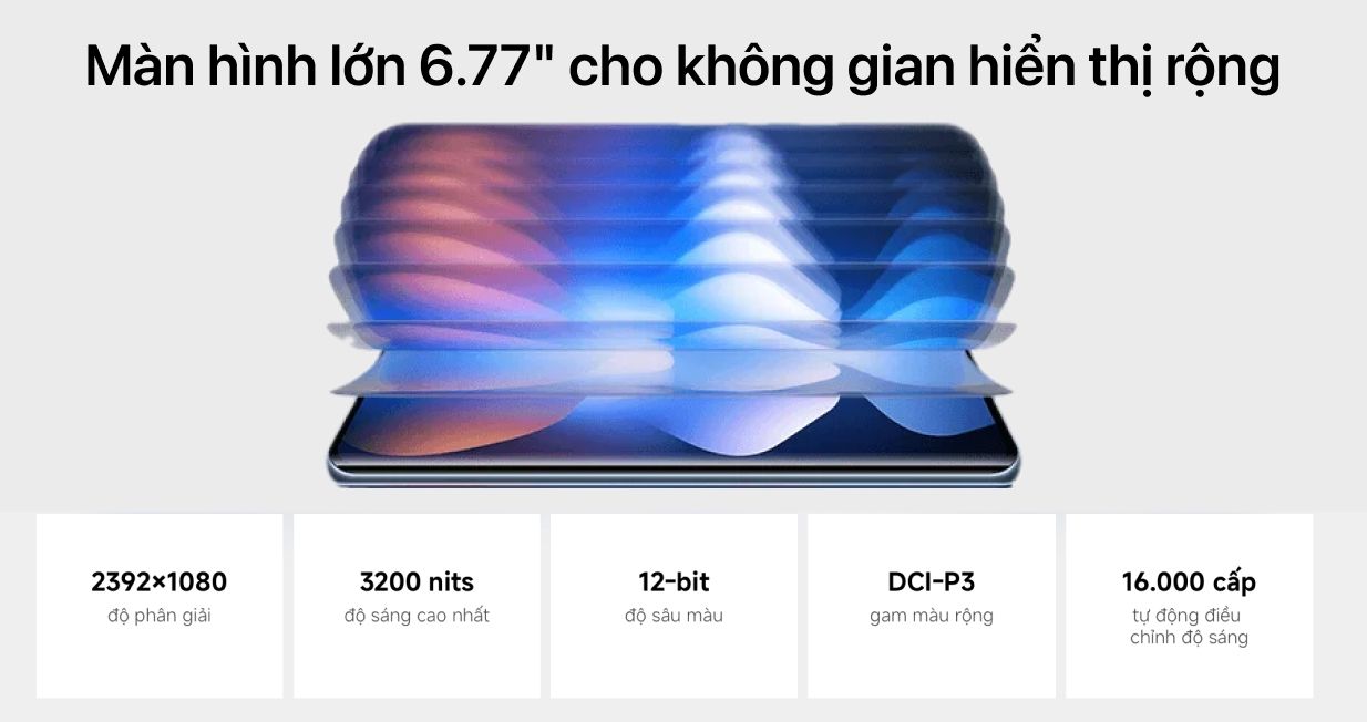 | Tính năng màn hình | Độ sáng tối đa 3200 nits, 12-bit, DCI-P3, PWM 3840Hz, TÜV Rheinland giảm ánh sáng xanh, TÜV Rheinland thân thiện nhịp sinh học, TÜV Rheinland Flicker Free |