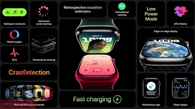 Hỗ trợ các bài tập hằng ngày để rèn luyện sức khỏe. Theo dõi sức khỏe, đo nồng độ oxy, điện tâm đồ,.. Theo dõi các giai đoạn giấc ngủ Cảm biến nhiệt độ Theo dõi chu kỳ rụng trứng SOS gọi khẩn cấp Gọi khẩn quốc tế Phát hiện rơi, va chạm Giám sát tiếng ồn |