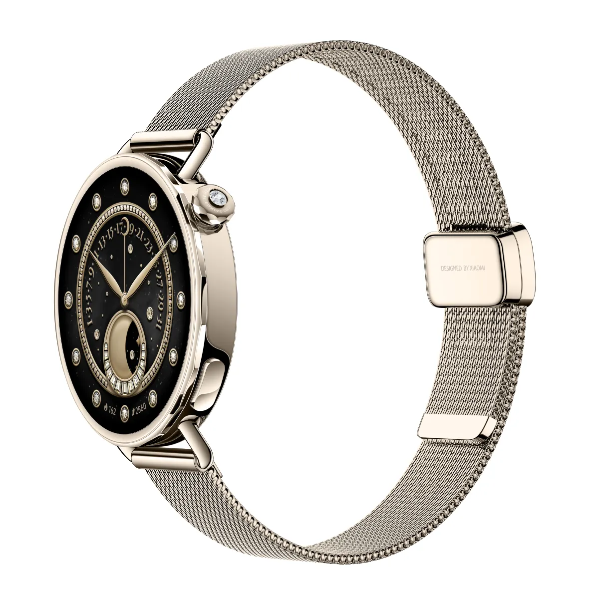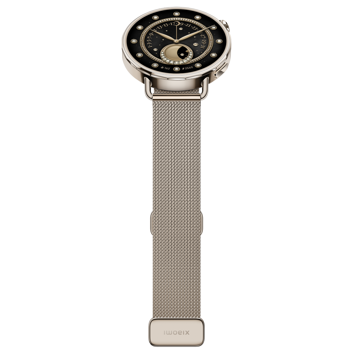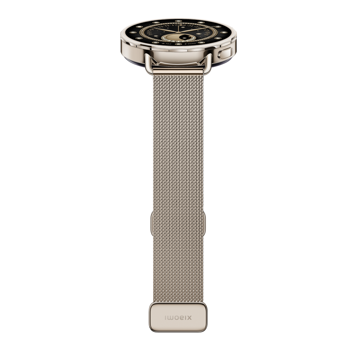Chất liệu thép không gỉ màu vàng kết hợp chi tiết nút xoay gắn kim cương nhân tạo giúp thiết bị tăng tính thẩm mỹ và thu hút ánh nhìn. Trọng lượng Xiaomi Watch S4 chỉ 32g (không bao gồm dây đeo) đảm bảo sự thoải mái trong suốt quá trình sử dụng.
