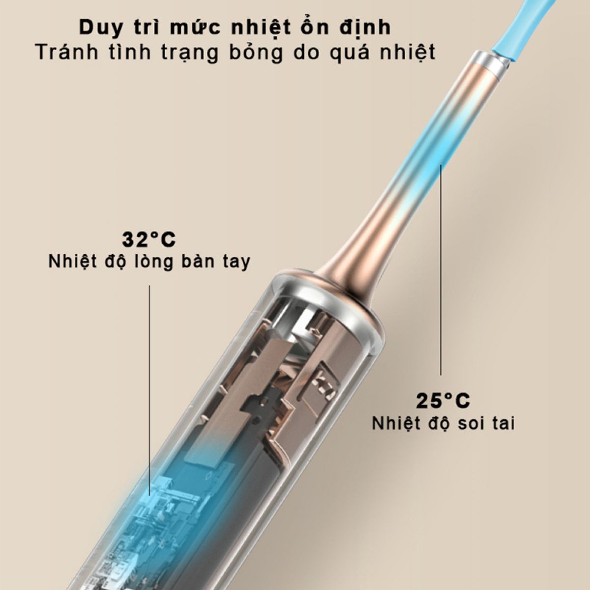 Dòng sản phẩm chăm sóc sức khỏe - làm đẹp này nổi bật với thiết kế hiện đại và khả năng hoạt động bền bỉ nhờ viên pin lithium 300mAh. Thiết bị có thể sử dụng liên tục đến 60 ngày nếu mỗi tuần dùng khoảng 10 phút, đáp ứng tốt nhu cầu chăm sóc tai định kỳ.
