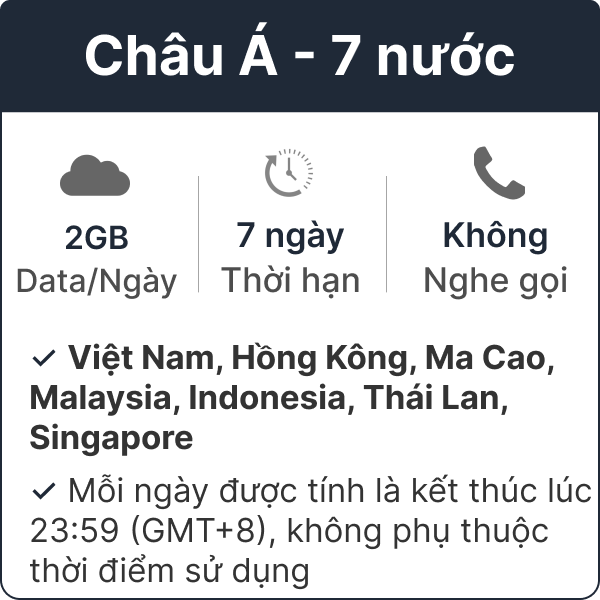 eSIM du lịch Gohub Châu Á 2GB 7 ngày hỗ trợ người dùng kết nối mạng tại Việt Nam, Hồng Kông, Ma Cao, Malaysia, Indonesia, Thái Lan và Singapore. Người sử dụng có thể di chuyển linh hoạt giữa các nước này mà không cần thực hiện việc thay đổi thẻ sim vật lý rườm rà.