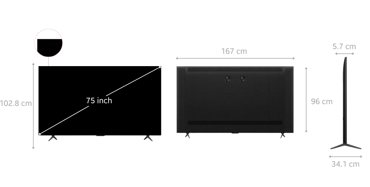 Đặc biệt, tivi có kích thước màn hình lên đến 75 inch, mang đến sự hiện diện mạnh mẽ, phù hợp với các không gian lớn. Ngoài ra, chân đế thiết kế cách điệu theo dạng chữ V, giữ thiết bị ổn định trên mặt phẳng.