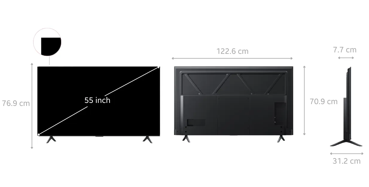 Chân đế đôi của thiết bị được thiết kế vững chắc, hỗ trợ đặt tivi ổn định trên mặt phẳng mà không chiếm quá nhiều diện tích. Ngoài ra, Tivi còn hỗ trợ giá treo tường tiêu chuẩn, tạo thêm sự linh hoạt trong cách bố trí không gian sống. Thiết kế tổng thể tivi hướng đến sự gọn gàng, tinh giản, trở thành điểm nhấn có tính thẩm mỹ cao.