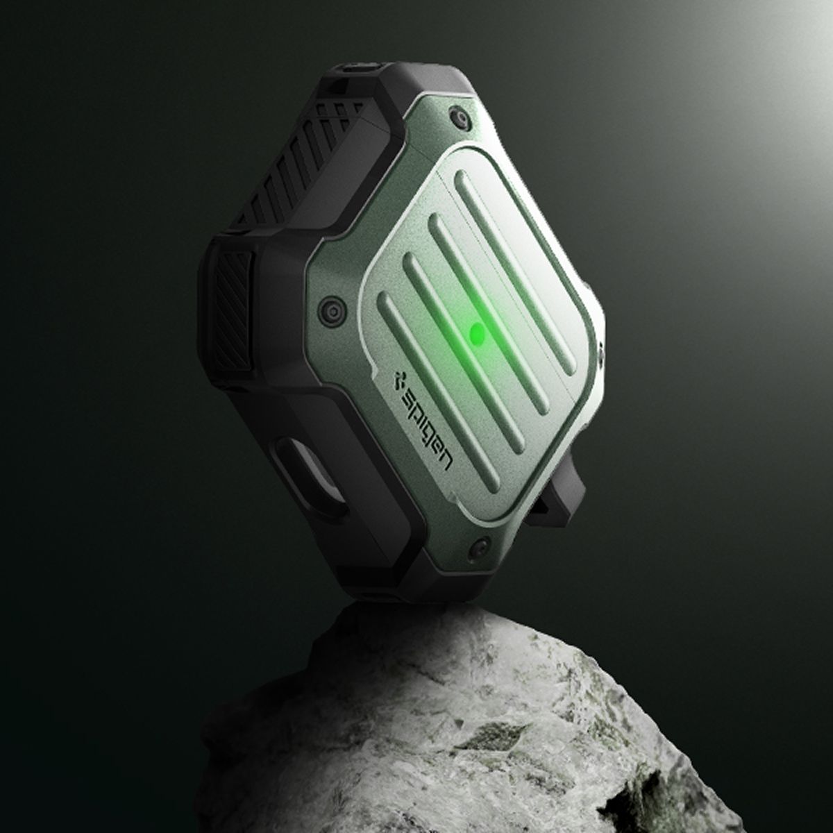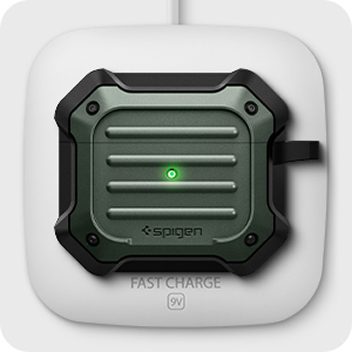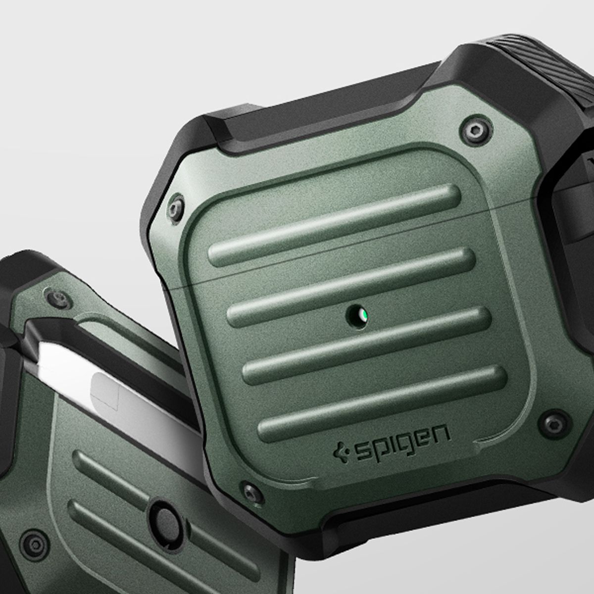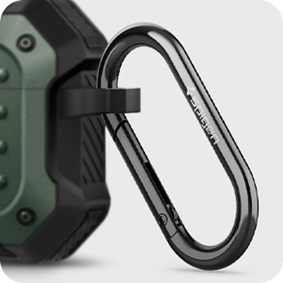 Hộp đựng tai nghe Apple Airpods 3 Spigen Tough Armor DRS giúp người dùng sạc pin mà không cần tháo. Sản phẩm đi kèm móc, hỗ trợ người dùng gắn vào túi xách hoặc thắt lưng để mang theo.