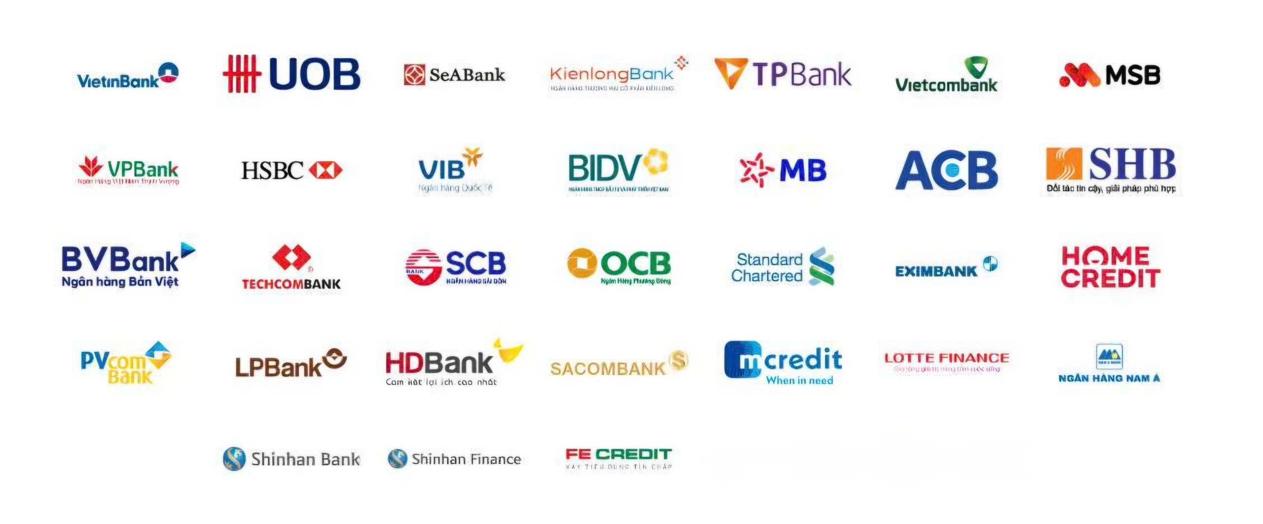 OCB, SHINHAN BANK, BIDV, VIETCOMBANK, VPBANK, ACB, HOMECREDIT, HSBC, MSB, TECHCOMBANK, STANDARD CHARTERED, BVBANK, MBBANK, Nam Á Bank |
