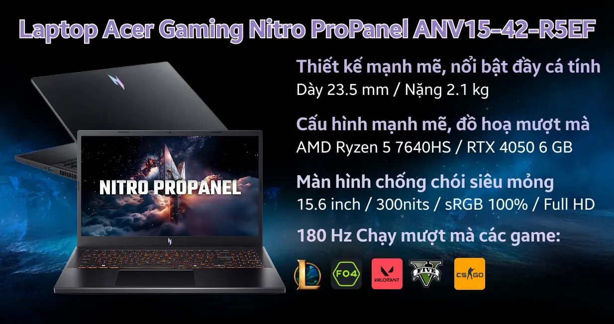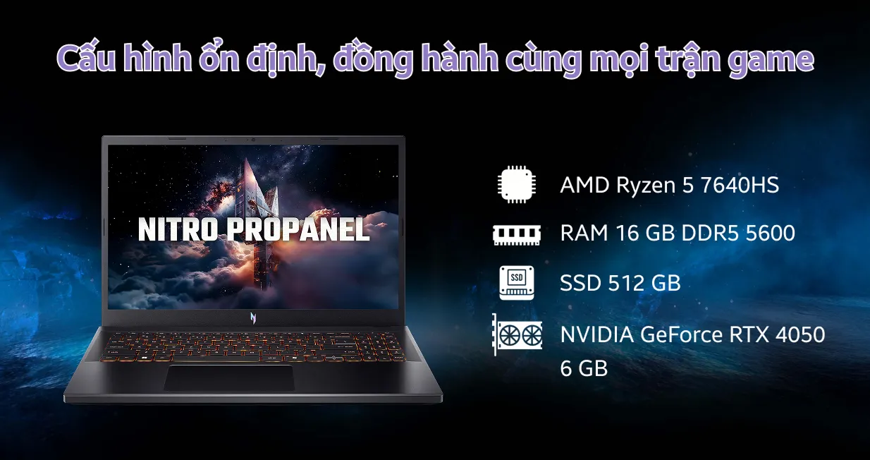 | Loại CPU | AMD Ryzen 5 7640HS (6 lõi / 12 luồng, Base Clock: 4.3 GHz, Max. Boost Clock: Up to 5 GHz, 16 MB) |