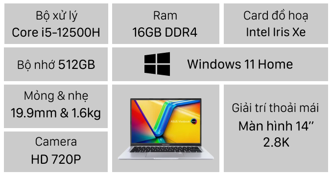 Loại CPU | Intel Core i5-12500H 2.5 GHz (18M Cache, up to 4.5 GHz, 4P+8E lõi) |