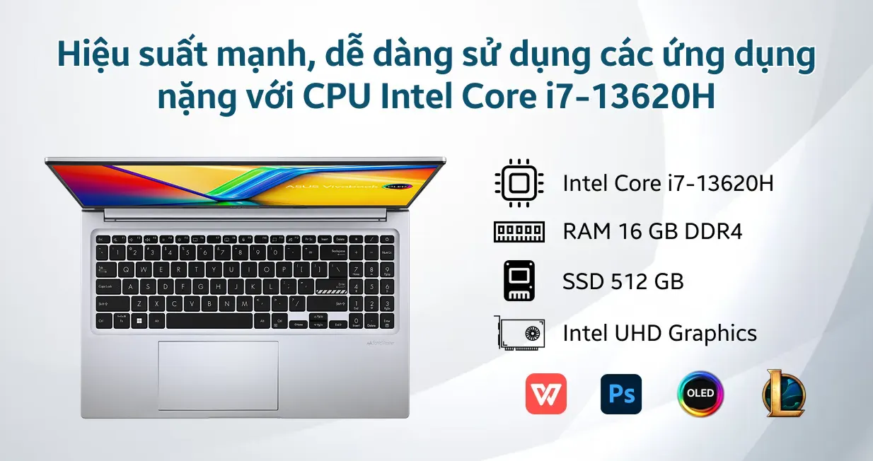Laptop Asus Vivobook 15 OLED A1505VA-L1688W được trang bị vi xử lý Intel Core i7-13620H thế hệ 13, sở hữu tới 10 nhân và 16 luồng, giúp xử lý trơn tru hầu hết tác vụ. Với xung nhịp tối đa lên tới 4.9GHz và bộ nhớ đệm 24MB, con chip này mang lại hiệu năng vượt trội trong tầm giá, đáp ứng mọi nhu cầu từ cơ bản tới nâng cao.