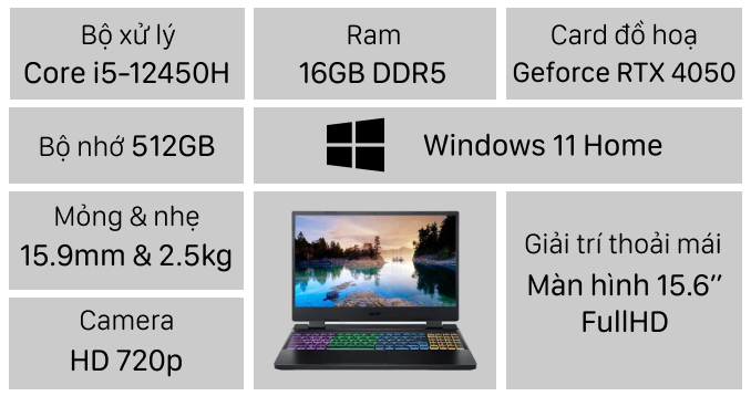I5-12450H/16GB/512GB PCIE/VGA 6GB RTX4050/15.6 FHD 144HZ/WIN11/ĐEN