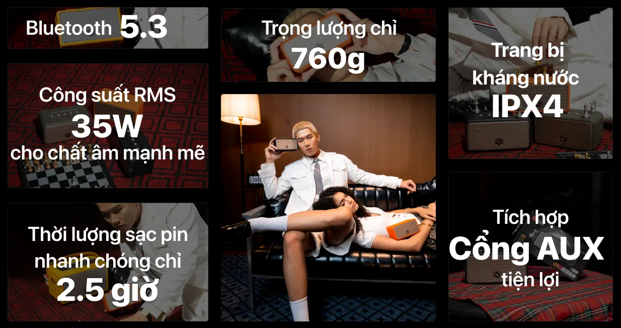 Nhà sản xuất trang bị 1 củ loa woofer 1.9 × 3.5 inch, 1 tweeter vòm 20 lõi và màng rung thụ động với công suất RMS 35 Watt và công suất đỉnh 60 Watt. Sự kết hợp này mang đến khả năng tái hiện âm trầm sâu lắng và đầy đặn, xử lý tốt mọi thể loại nhạc, từ những bản R&B tình cảm cho tới rock, pop sôi động. Bên cạnh đó, sản phẩm hỗ trợ công nghệ TWS (đồng bộ hoá không dây) giúp mở rộng không gian âm thanh và nâng cao công suất đầu ra.