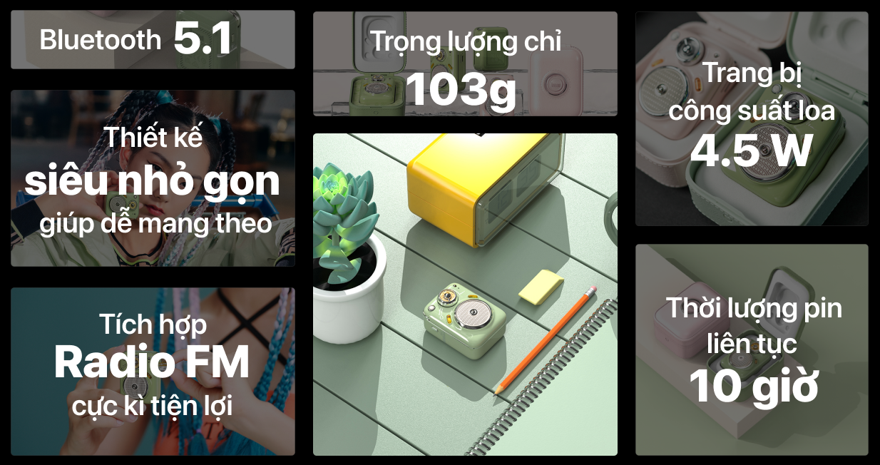 Loa Bluetooth Divoom Beetles-FM II sở hữu công suất 4.5W mạnh mẽ cùng với kết nối Bluetooth 5.1, mang đến trải nghiệm âm thanh ổn định và rõ nét. Với trọng lượng siêu nhẹ 103g, người dùng có thể mang theo đi bất cứ đâu. Loa còn tích hợp 3 chế độ âm thanh: Bluetooth, Radio FM, thẻ nhớ TF cùng pin dùng trên 10 giờ.