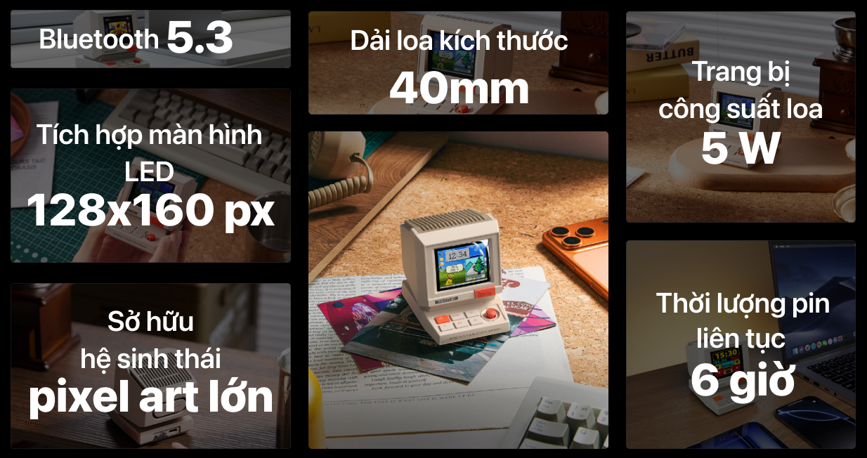 Thiết bị còn nổi bật với hệ sinh thái pixel art phong phú, cho trải nghiệm giải trí mang tính cá nhân hóa cao. Thông qua màn hình LED, loa Bluetooth Divoom MiniToo có thể hiển thị nhiều hình ảnh pixel khác nhau. Hệ sinh thái này hiện đang sở hữu hơn 10 triệu tác phẩm pixel art cho phép người dùng khám phá nhiều nội dung độc đáo.