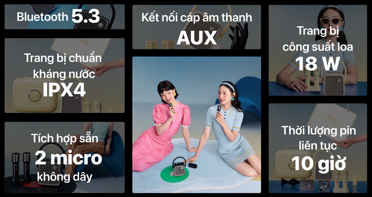 Bên cạnh đó, loa còn cho phép phát nhạc từ nhiều thiết bị với Bluetooth 5.2 cùng cổng AUX tiện lợi. Micro không dây hoạt động trong phạm vi dưới 10m, cho phép người dùng thoải mái di chuyển khi hát.