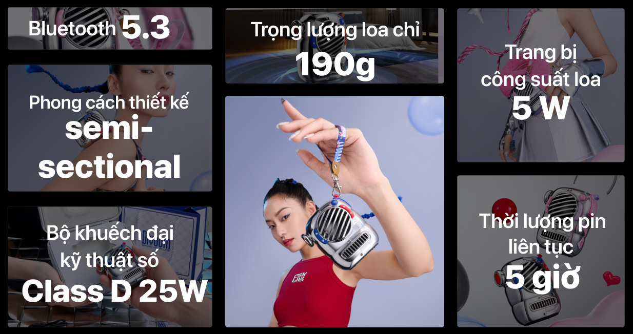 Loa bluetooth Divoom Spark Pop trở nên thu hút ánh nhìn nhờ mang thiết kế "semi-sectional" độc đáo, được lấy cảm hứng từ bộ trang phục phi hành gia. Sản phẩm sở hữu trọng lượng chỉ 190g cùng dây đeo thời trang. Thiết bị còn mang đến chất âm tuyệt vời với công nghệ lọc âm thanh tới từ Divoom.