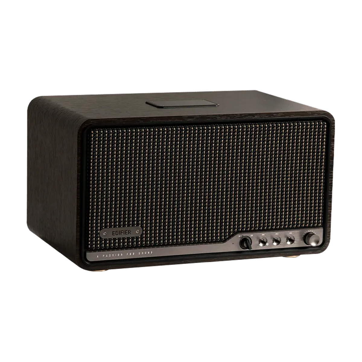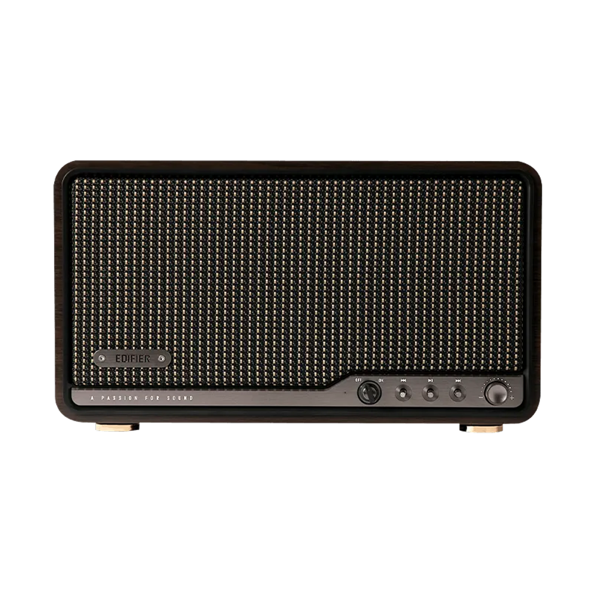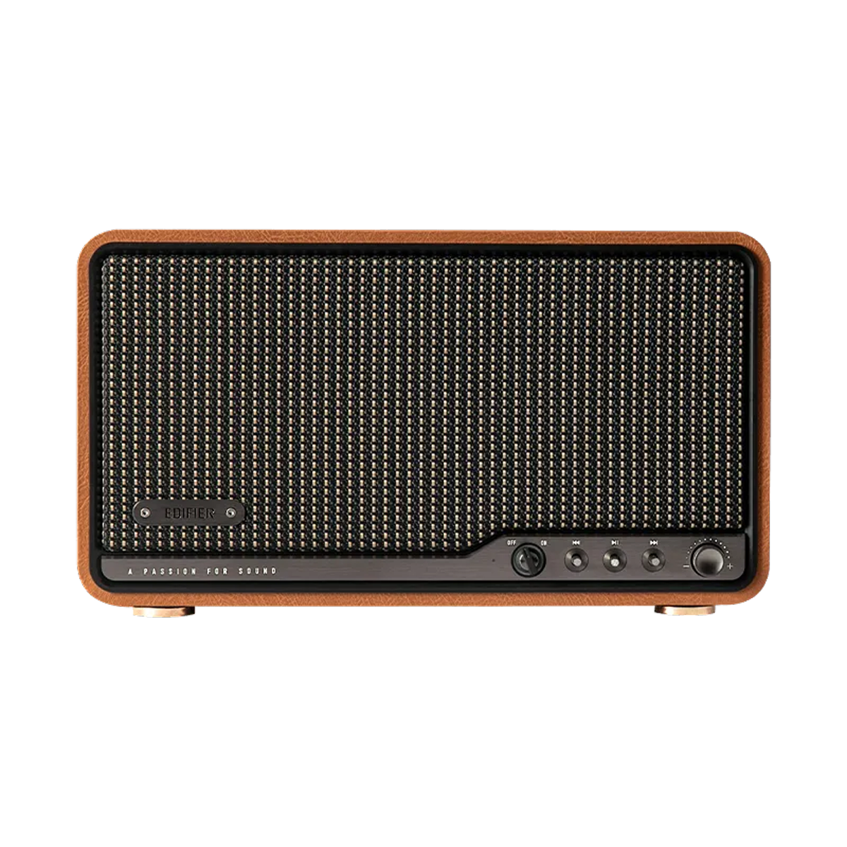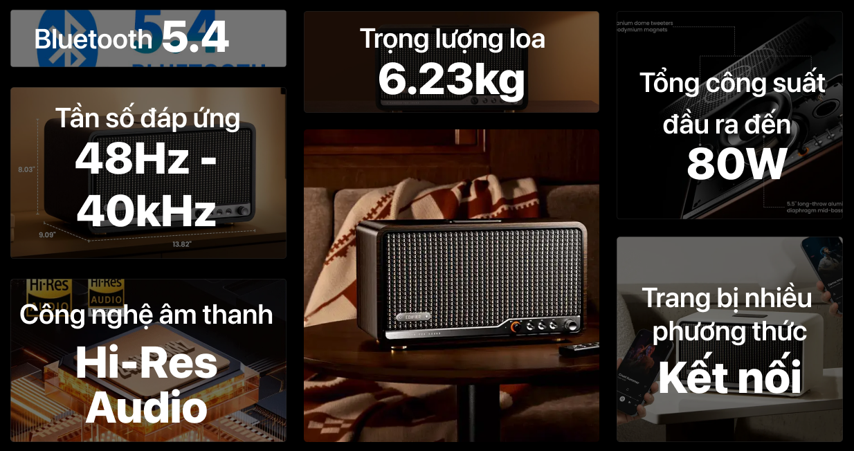 Sản phẩm gây ấn tượng nhờ sự kết hợp hài hòa giữa phong cách cổ điển và hiện đại, tạo nên nét sang trọng trong từng chi tiết. Thiết kế loa dạng tủ gỗ thủ công kết hợp lưới loa bện tinh xảo cùng núm điều chỉnh kim loại mang đến vẻ ngoài tinh tế.