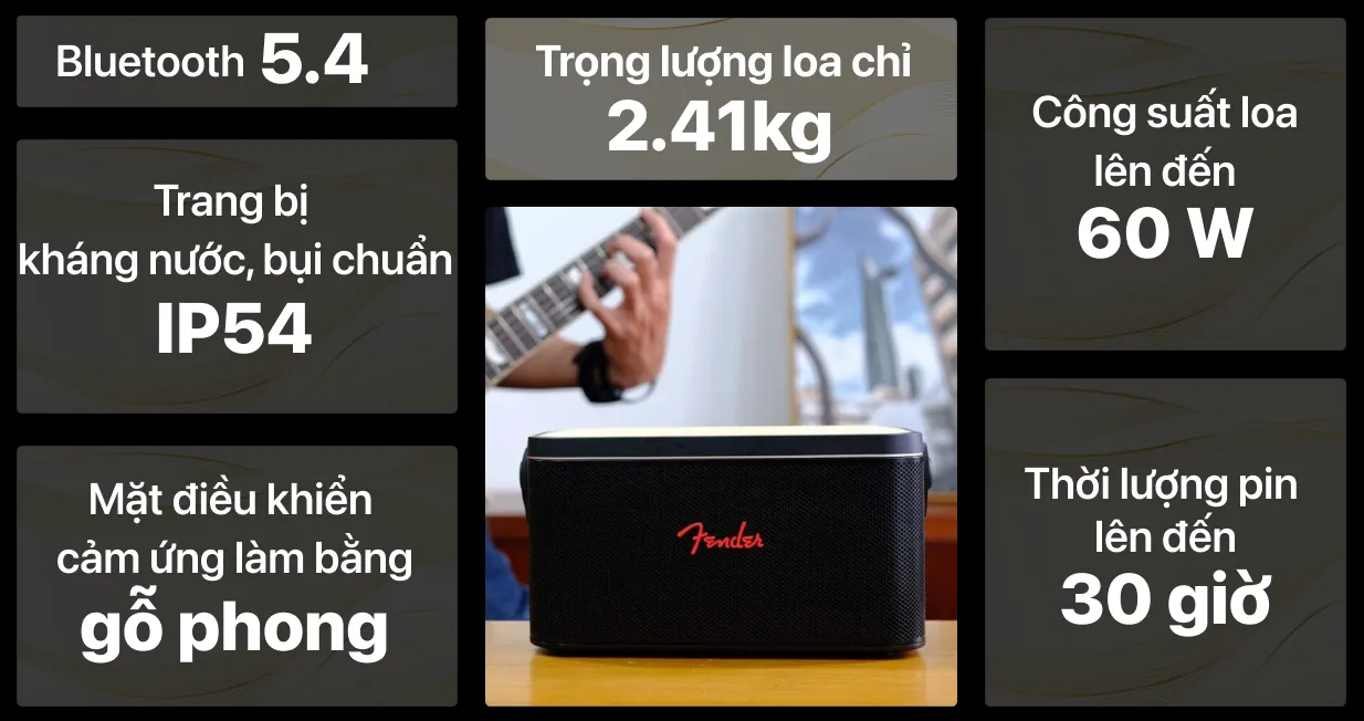 Giảm 500K khi thanh toán bằng thẻ tín dụng SacombankLoa Bluetooth Fender Riff trang bị công suất lớn đến 60W, bao gồm 2 loa trầm toàn dải, 2 loa tép cùng 2 bộ tản nhiệt âm trầm cho âm thanh đầy mạnh mẽ. Sản phẩm cho thời gian đến 30 giờ hỗ trợ sạc nhanh trong 30 phút có thể phát nhạc 8 giờ. Loa hỗ trợ thêm công nghệ Bluetooth 5.2, mang đến kết nối ổn định với độ trễ thấp.