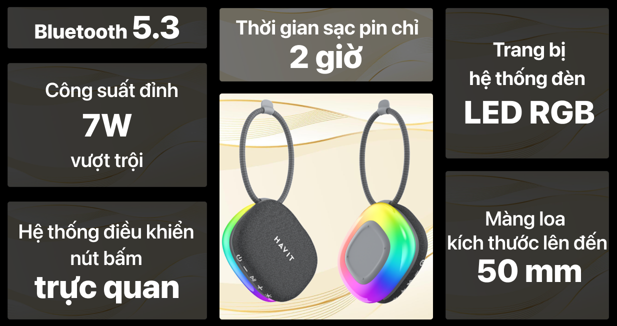 Giảm 500K khi thanh toán bằng thẻ tín dụng HDBankLoa Bluetooth Havit SK830BT mang lại âm thanh đủ lớn cho các không gian nhỏ và vừa nhờ được trang bị màng loa kích thước 50mm và công suất lên tới 7W. Mẫu loa Havit này còn tạo nên điểm nhấn với dải đèn LED RGB lớn. Thời lượng pin 6.5 giờ của loa sẽ phù hợp để mang theo và sử dụng khi đi du lịch, dã ngoại.