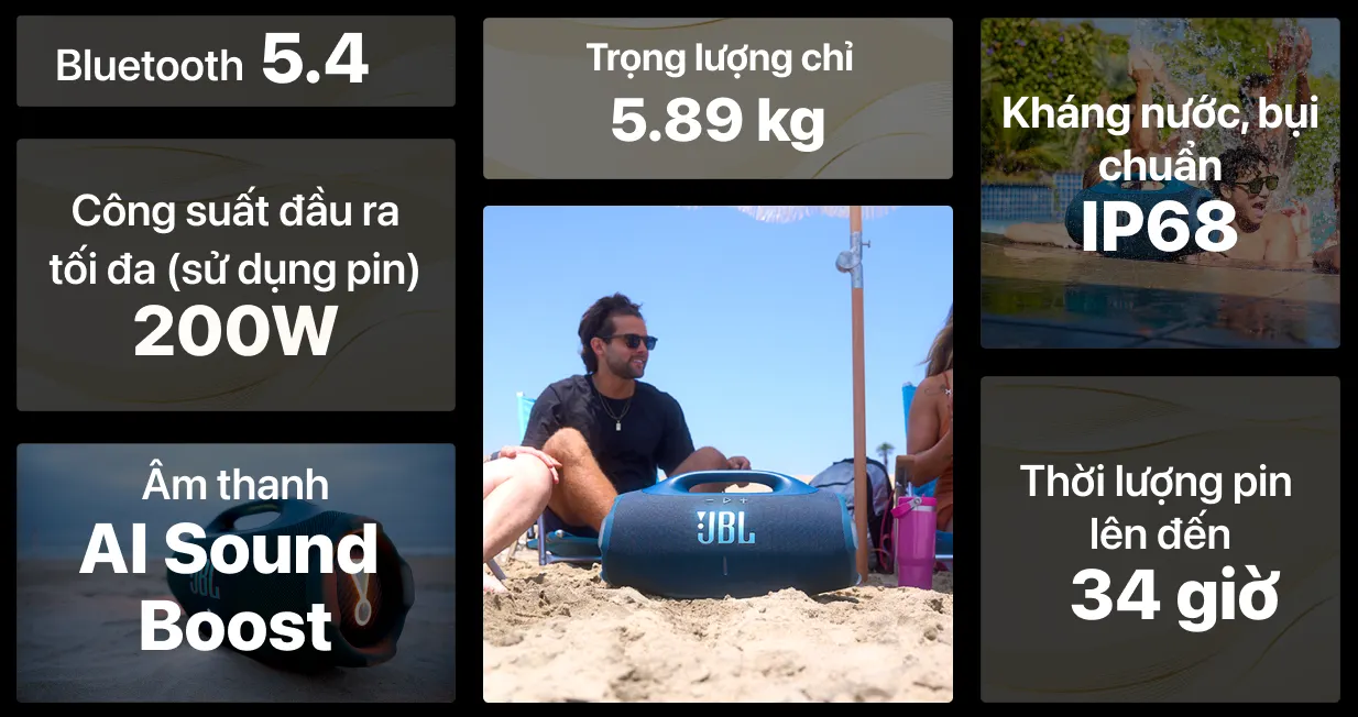 Ngoài ra, thiết kế tối ưu giúp pin của dòng loa này hoạt động bền bỉ theo thời gian, hạn chế tình trạng chai pin. Sự kết hợp giữa thời lượng pin ấn tượng và khả năng sạc nhanh chính là điểm cộng lớn khiến mẫu loa Boombox 4 này chinh phục người dùng yêu thích khám phá và di chuyển.