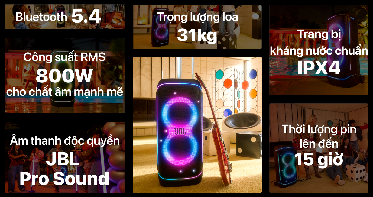 Giảm 500K khi thanh toán bằng thẻ tín dụng HDBankLoa Bluetooth JBL Partybox 720 có công suất lên đến 800W, được hỗ trợ JBL Pro Sound cho hiệu ứng âm thanh phát ra có độ chân thật cao. Loa tích hợp cổng gắn guitar, hỗ trợ Bluetooth 5.4 cho phép kết nối với micro để hát karaoke. Ngoài ra nhờ chuẩn IPX4, người dùng có thể sử dụng ở những bữa tiệc ngoài trời hay ở hồ bơi.