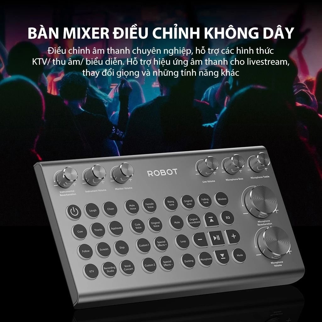 Chip DSP cao cấp tích hợp bên trong đóng vai trò lọc tạp âm cũng như tối ưu hóa giọng hát người dùng. Bàn mixer không dây đi kèm hỗ trợ tùy chỉnh âm sắc chuyên sâu, phục vụ cho các nhu cầu từ thu âm đến biểu diễn trực tiếp. Bộ đôi micro sóng UHF tặng kèm có độ trễ thấp, hạn chế tình trạng nhiễu sóng khi ca hát.