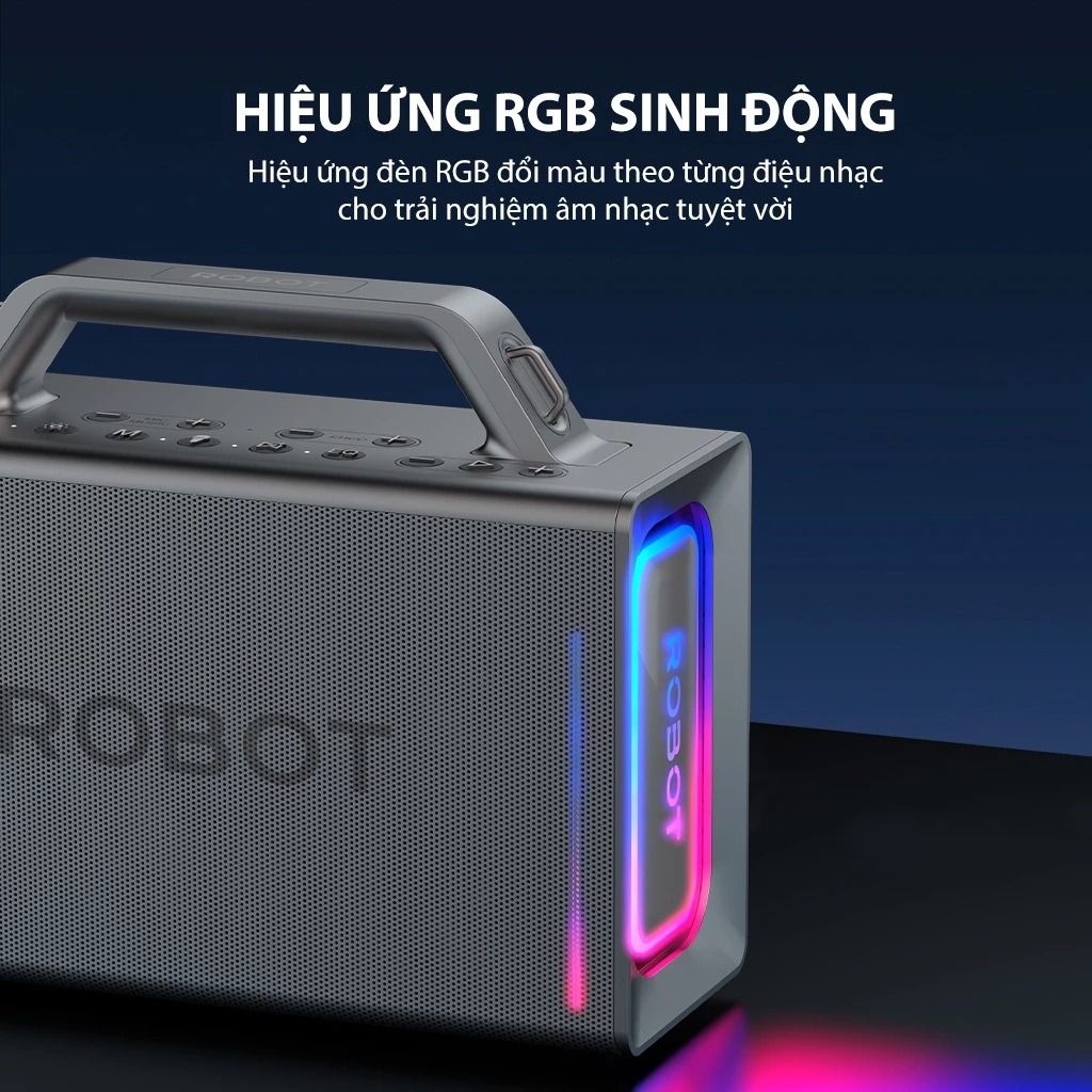 Loa Bluetooth Karaoke Robot RB90 100W kèm 2 micro gây ấn tượng với ngoại hình hiện đại mang đậm phong cách của dòng thiết bị âm thanh ngoài trời. Điểm nhấn nổi bật trên thân loa là dải đèn LED RGB có khả năng chuyển màu nhịp nhàng theo giai điệu bài hát.