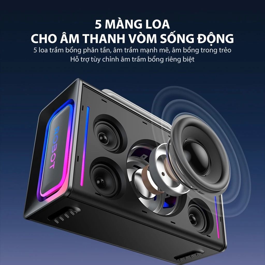 Loa Bluetooth Karaoke Robot RB90 100W kèm 2 micro sở hữu công suất mạnh mẽ 100W, giúp tái tạo âm thanh uy lực và lấp đầy không gian. Hệ thống 5 màng loa phân tần tạo nên hiệu ứng âm thanh với dải âm trầm sâu cùng âm bổng trong trẻo.