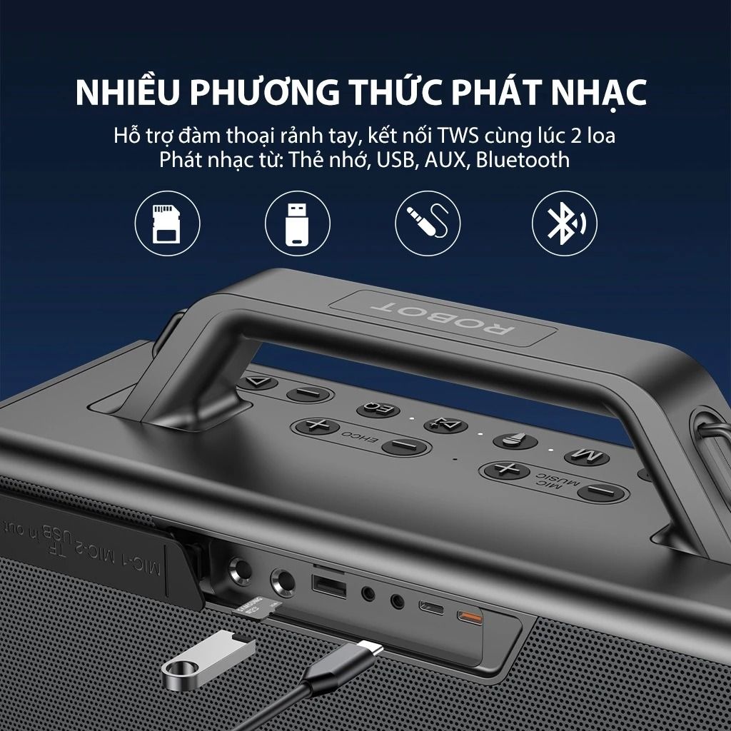 Loa Karaoke Robot RB90 100W kèm 2 micro ứng dụng công nghệ Bluetooth 5.3 tiên tiến để duy trì đường truyền tín hiệu ổn định ở phạm vi xa. Tính năng TWS cho phép ghép đôi không dây hai loa cùng lúc để tạo nên hệ thống âm thanh vòm lớn hơn.