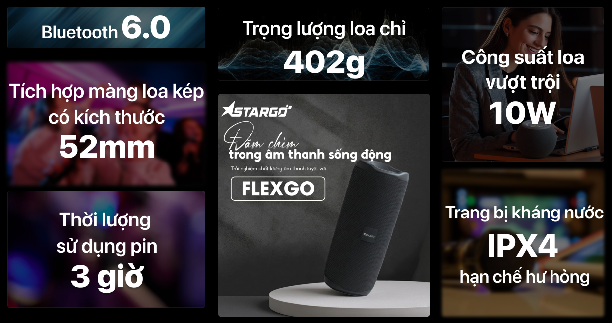Loa Bluetooth StarGO Flex Go được trang bị Bluetooth V6.0, giúp kết nối nhanh chóng và ổn định với các thiết bị. Người dùng có thể tận hưởng âm nhạc mà không bị gián đoạn nhờ kết nối ổn định trong phạm vi 10m. Loa dễ dàng ghép nối với smartphone, laptop hay các thiết bị khác, mang lại trải nghiệm nghe nhạc tiện lợi.