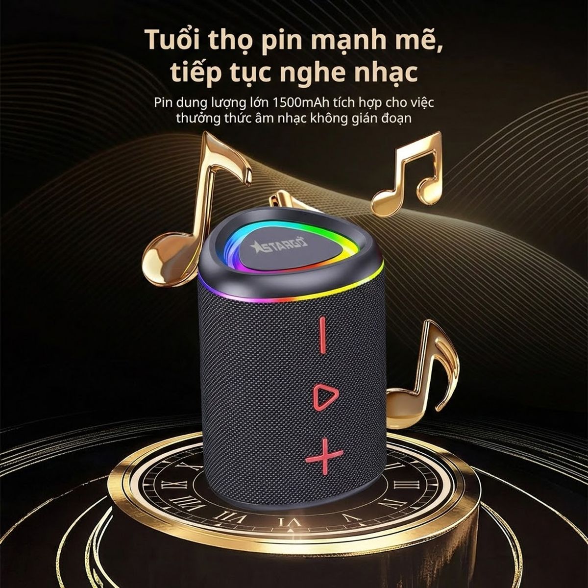 Loa Bluetooth StarGo Luna Mini tích hợp pin dung lượng đến 1500mAh cùng điện áp 3.7V, cung cấp nguồn năng lượng ổn định để thiết bị có thể hoạt động liên tục. Theo thông tin hãng, sản phẩm đáp ứng thời gian phát nhạc trong khoảng 3 giờ đồng hồ ở mức âm lượng thường, đủ cho một buổi thư giãn, vui chơi nhẹ nhàng.