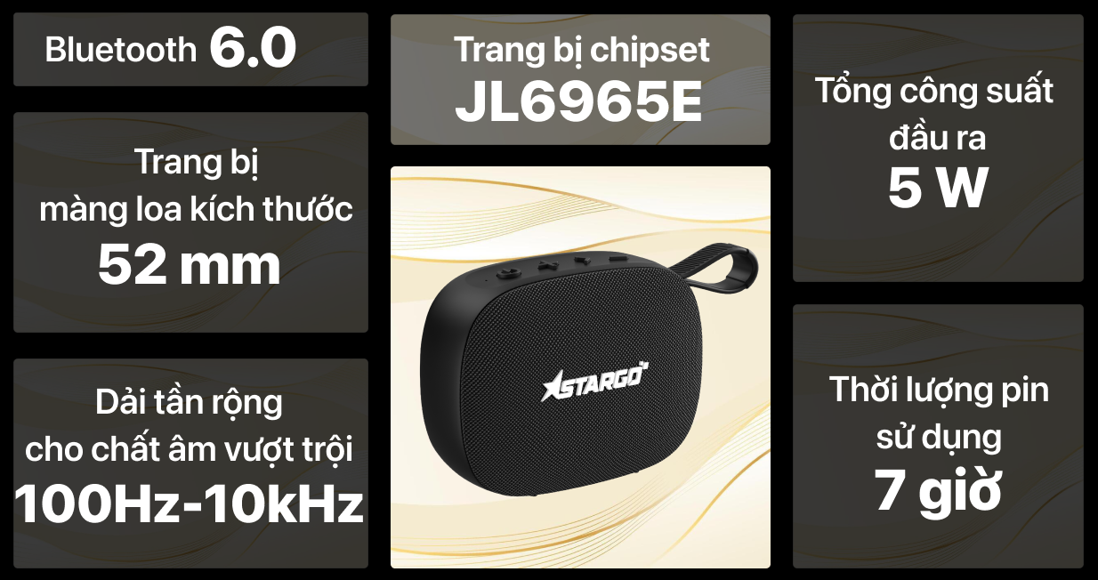 Thiết bị mang đến âm thanh rõ nét với bass mạnh mẽ, phù hợp cho nhiều thể loại nhạc. Công suất 5W giúp loa tái tạo âm thanh sống động, tạo trải nghiệm nghe nhạc chất lượng.