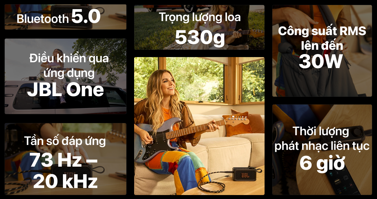 JBL BandBox Solo được trang bị công suất 30W RMS cùng củ loa toàn dải 2.25 inch, mang lại âm thanh rõ ràng, đủ lực cho cả vocal lẫn nhạc cụ điện. Dải tần 73 Hz-20 kHz giúp tái tạo từ âm trầm đến dải cao một cách linh hoạt.