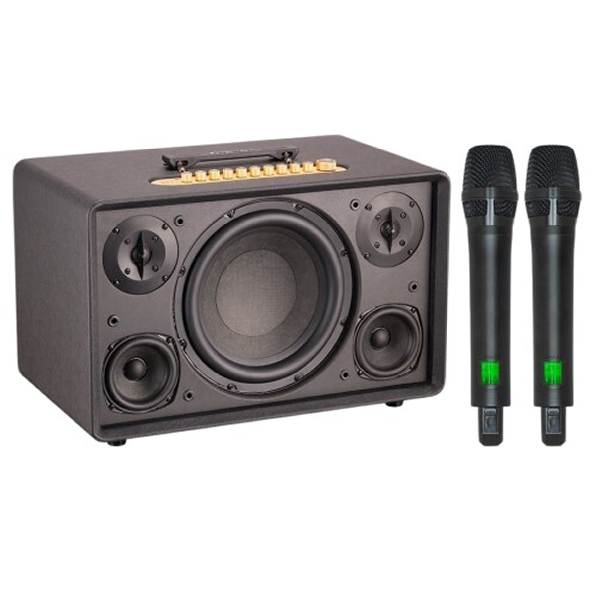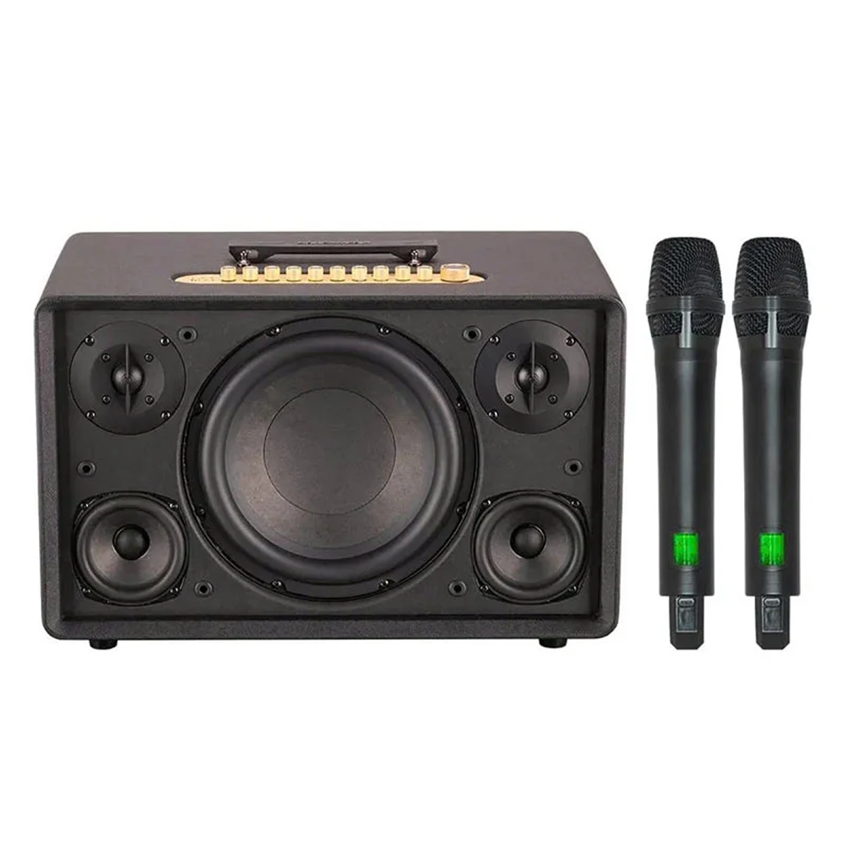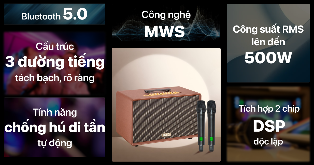 Bảng điều khiển phía trên bao gồm các nút chỉnh âm lượng và hiệu ứng Karaoke được bố trí khoa học. Sản phẩm cung cấp ba phiên bản màu sắc gồm đen, nâu và tím, đáp ứng sở thích đa dạng của người sử dụng. Kích thước 480x320x278 mm tạo sự vững chãi khi phát âm thanh ở mức công suất cao. Đây là thiết bị vừa phục vụ giải trí vừa làm vật dụng trang trí sang trọng.