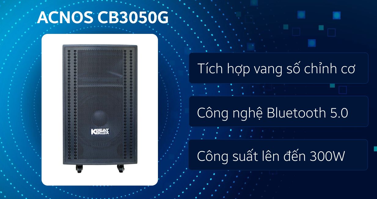 Giảm 500K khi thanh toán bằng thẻ tín dụng HDBankLoa kéo Karaoke ACNOS CB3050G có khả năng phát nhạc vô cùng mạnh mẽ khi sở hữu công suất vượt trội RMS 50W - PMPO 300W cùng hệ thống loa bass 3 tấc (30cm) và loa treble. Với công nghệ Bluetooth 5.0, loa kéo hỗ trợ người dùng kết nối nhanh chóng và ổn định khi sử dụng. Ngoài ra, mẫu loa ACNOS này còn sở hữu dung lượng pin lâu dài lên đến 2200mAh và 2 micro không dây UHF.