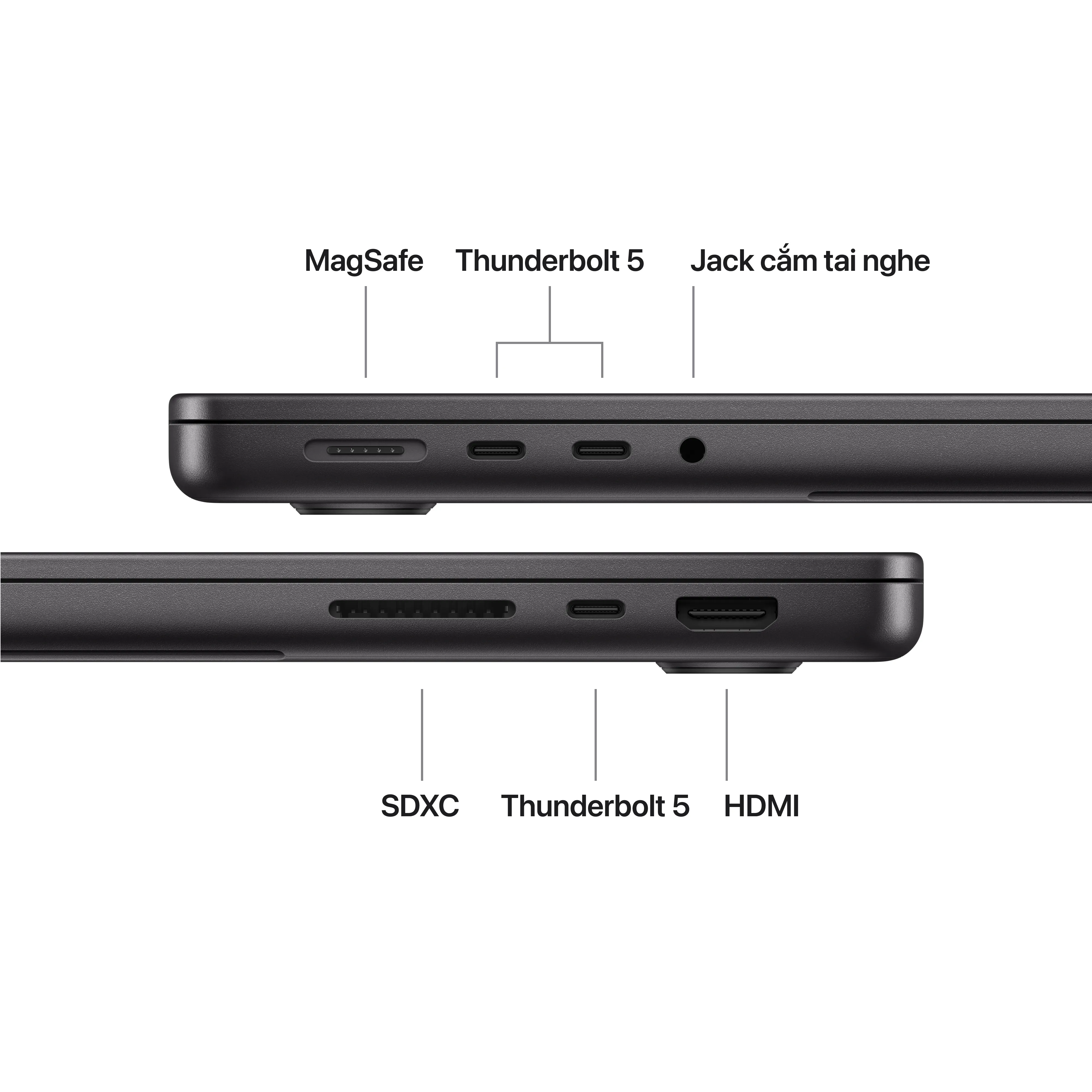 Sản phẩm còn được trang bị hệ thống cổng kết nối thông dụng như khe thẻ SDXC, cổng HDMI, jack tai nghe 3.5 mm, cổng sạc MagSafe 3 và ba cổng Thunderbolt 5. Nhờ đó, người dùng dễ dàng kết nối với màn hình ngoài, thiết bị lưu trữ hoặc phụ kiện ngoại vi, đồng thời hỗ trợ truyền dữ liệu và sạc thiết bị với tốc độ cao.