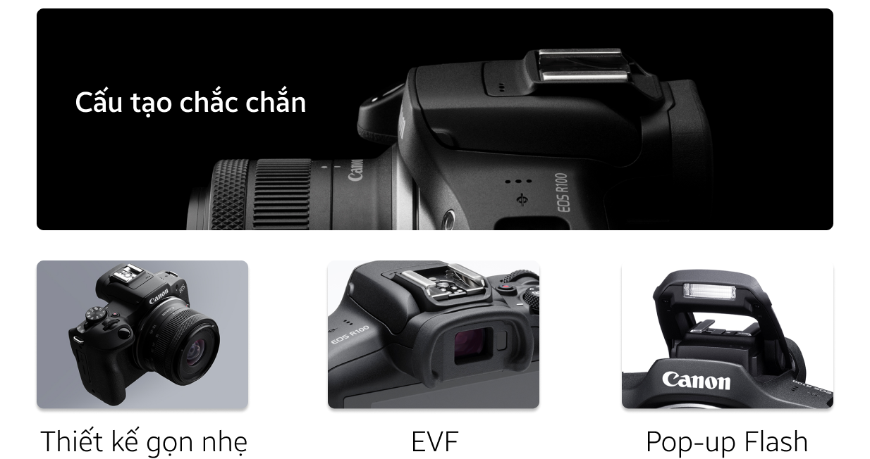 • Canon R100: Hướng đến người dùng có nhu cầu cao hơn, với nhiều tính năng chuyên nghiệp hơn như chế độ chụp liên tục nhanh, tùy chỉnh sâu hơn.