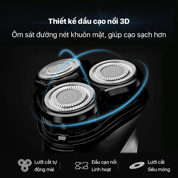 Đặc biệt hơn, phần đầu cạo của thiết bị còn được tích hợp cụm 3 đầu dao 3D chất lượng cao giúp quá trình cạo râu của bạn thêm phần trơn tru, mượt mà hơn. Với đầu dao 3D, diện tích tiếp xúc với khuôn mặt của máy tăng lên đáng kể, cũng như có thể cạo sát với từng góc cạnh trên khuôn mặt người dùng.