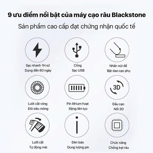 - Thời lượng pin vượt trội: Bên trong máy cạo râu là dung lượng pin với thời gian hoạt động lên đến 85 phút. Nhờ vào đó, bạn có thể cạo râu liên tục mà không bị gián đoạn;