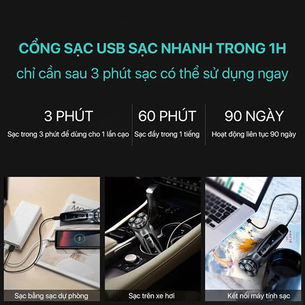 Thời lượng pin của máy cạo lên đến 85 phút nên bạn có thể sử dụng khi đi du lịch mà không cần lo lắng quá về việc thiết bị sẽ hết pin. Ngoài ra, thiết bị cũng hỗ trợ tốc độ sạc nhanh chóng khi bạn có thể nạp đầy dung lượng pin trong vòng 60 phút thông qua cổng USB-Type C.