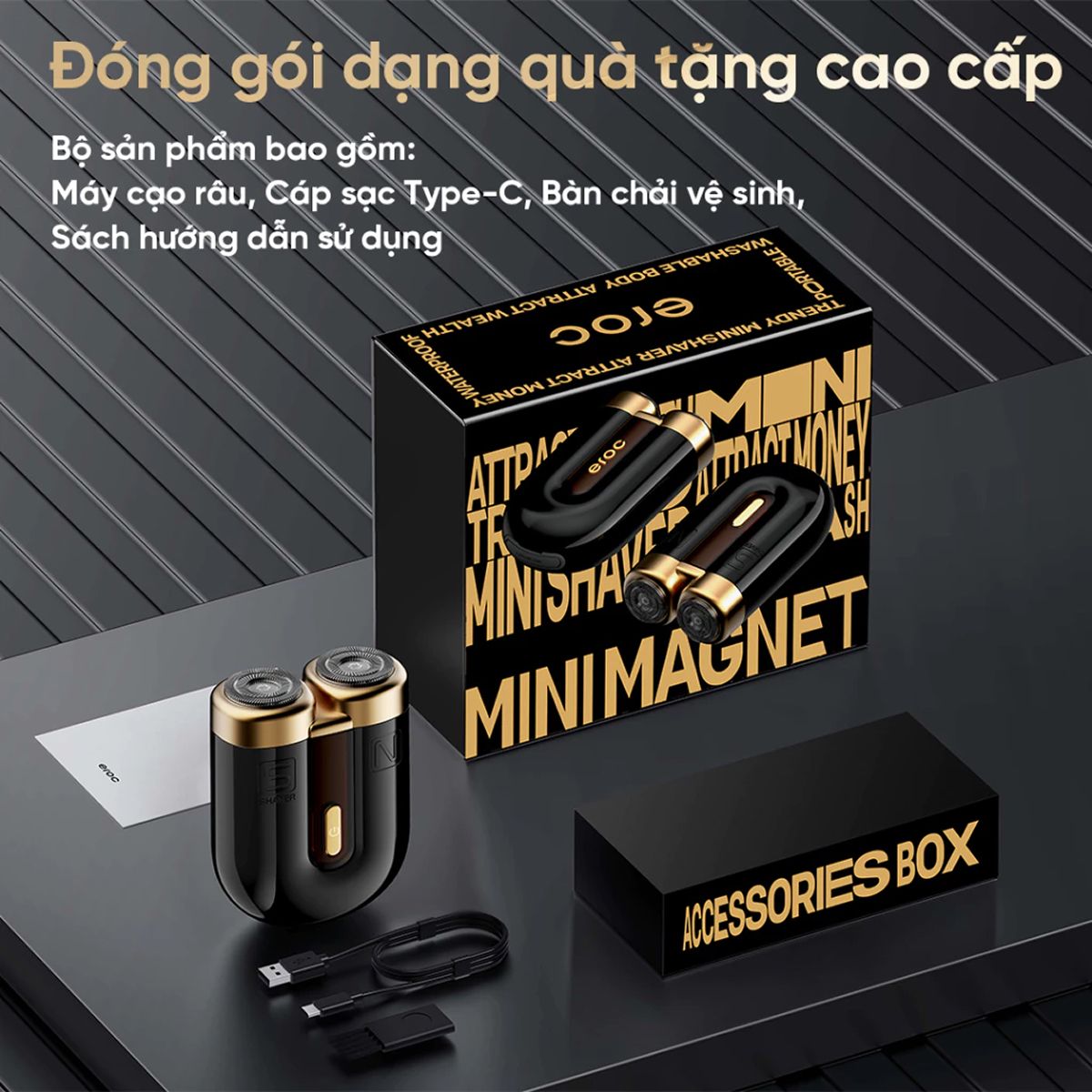Máy cạo râu mini EROC Magnet EROCCT020-BG được trang bị động cơ lên đến 7000RPM đi kèm lưỡi dao kép, từ đó giúp người dùng vệ sinh sạch nhanh hơn. Sản phẩm nhỏ gọn cùng cơ chế nam châm, để dễ dàng mang theo khi di chuyển. Máy cạo râu còn đạt chuẩn IPX7 cùng với thời lượng pin cao, đáp ứng tốt nhu cầu dùng.