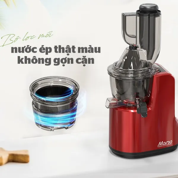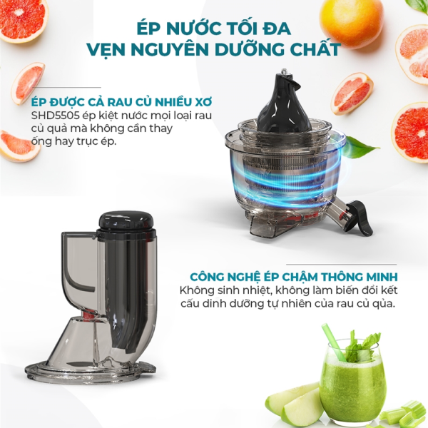 Máy ép chậm Sunhouse Mama SHD5505 không chỉ giúp ép kiệt nước từ những loại rau củ quả nhiều xơ mà còn hạn chế tình trạng tách nước trong quá trình bảo quản, đảm bảo thành phẩm giữ nguyên màu sắc nguyên thuỷ, không đổi màu đổi vị.