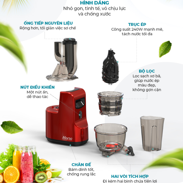 Nhờ vào công suất mạnh mẽ lên đến 240W, máy ép chậm có thể nghiền nát và ép kiệt bã hoàn toàn từ nguyên liệu, giữ lại chỉ những chất dinh dưỡng quan trọng nhất trong nước ép. Quá trình ép kiệt bã từ rau củ quả nhiều xơ giúp bạn tận dụng toàn bộ giá trị dinh dưỡng có trong nguyên liệu.