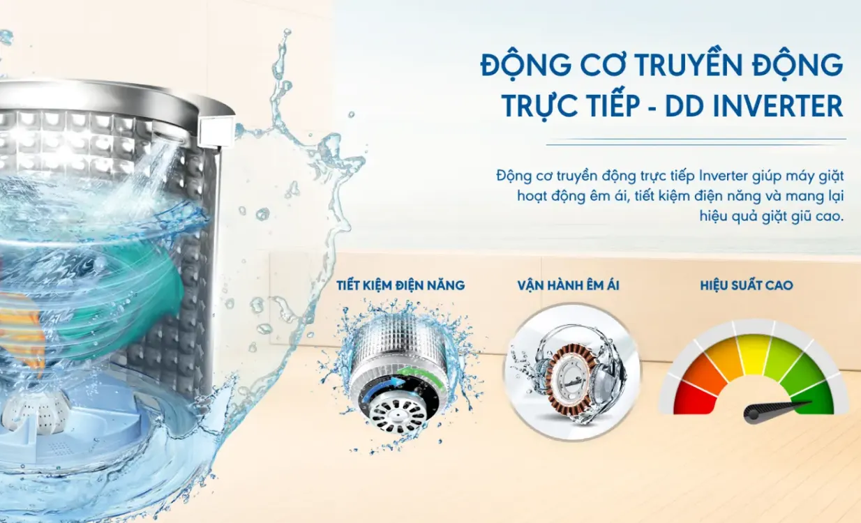Với công nghệ DD Inverter, máy có khả năng điều chỉnh vòng quay linh hoạt tùy theo khối lượng đồ giặt và chế độ đã chọn. Qua đó điện năng tiêu thụ được tối ưu hiệu quả. Hiệu suất sử dụng điện đạt 4.9 Wh/kg phù hợp cho gia đình sử dụng thường xuyên.