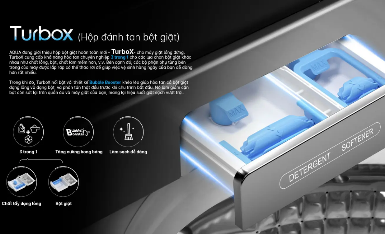 Máy giặt Aqua cửa trên (AQW-DR120HT.BK) là sản phẩm phù hợp với gia đình đông thành viên hoặc có nhu cầu giặt giũ khối lượng lớn. Sản phẩm này tích hợp nhiều công nghệ hiện đại, hứa hẹn mang lại hiệu quả giặt sạch tối ưu và tiết kiệm điện năng.